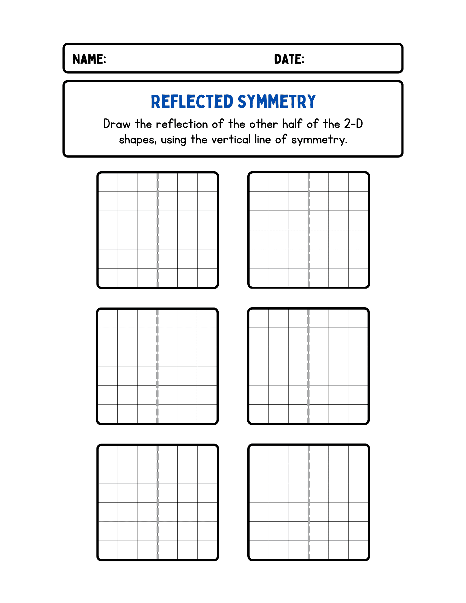 These Lines of Symmetry Drawing Activity Worksheets provide a fun and educational way for children to explore reflected symmetry using simple and bold printable designs. Each worksheet includes half-drawn 2D shapes that students must complete by drawing the reflection across a vertical or horizontal line of symmetry.
