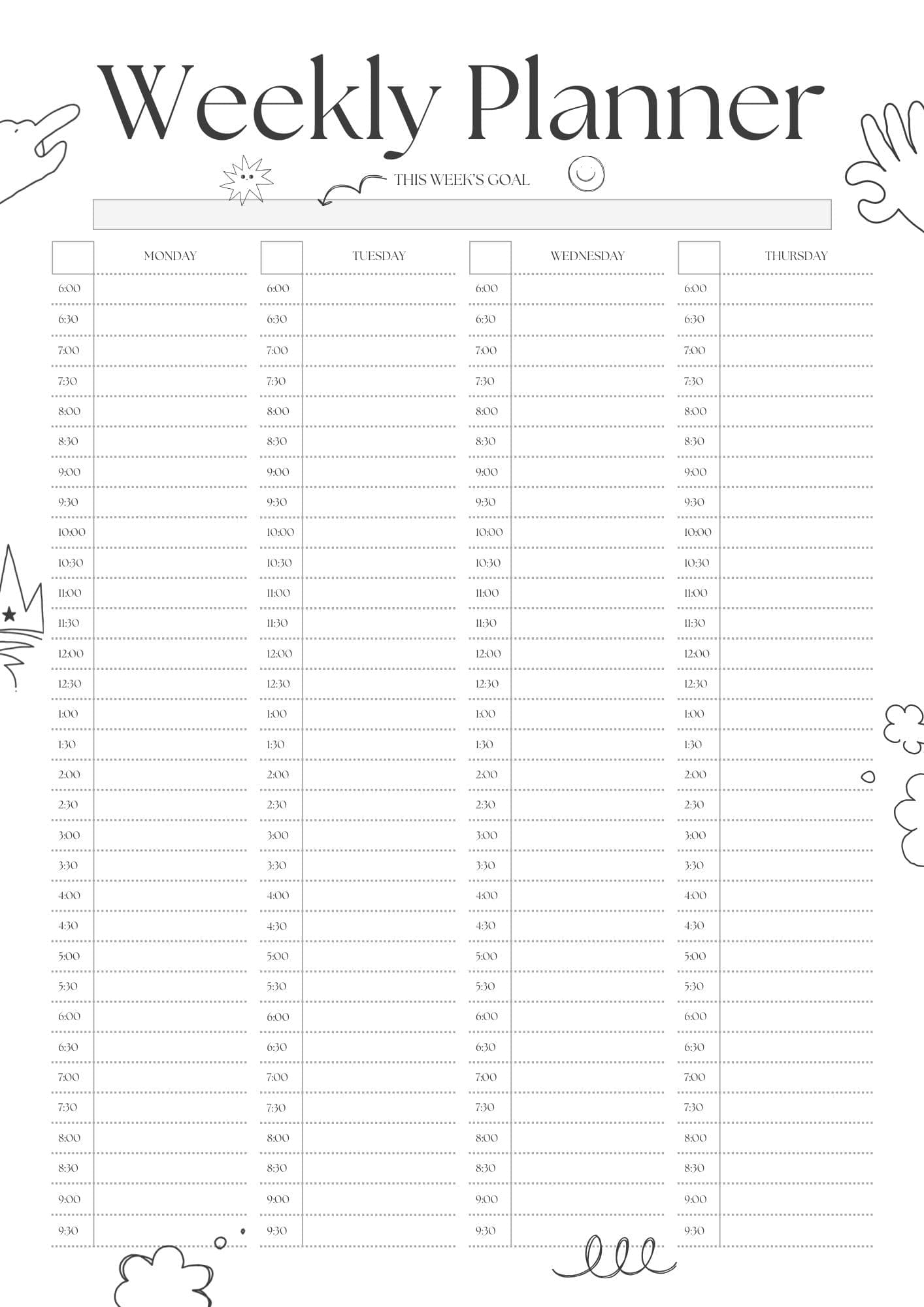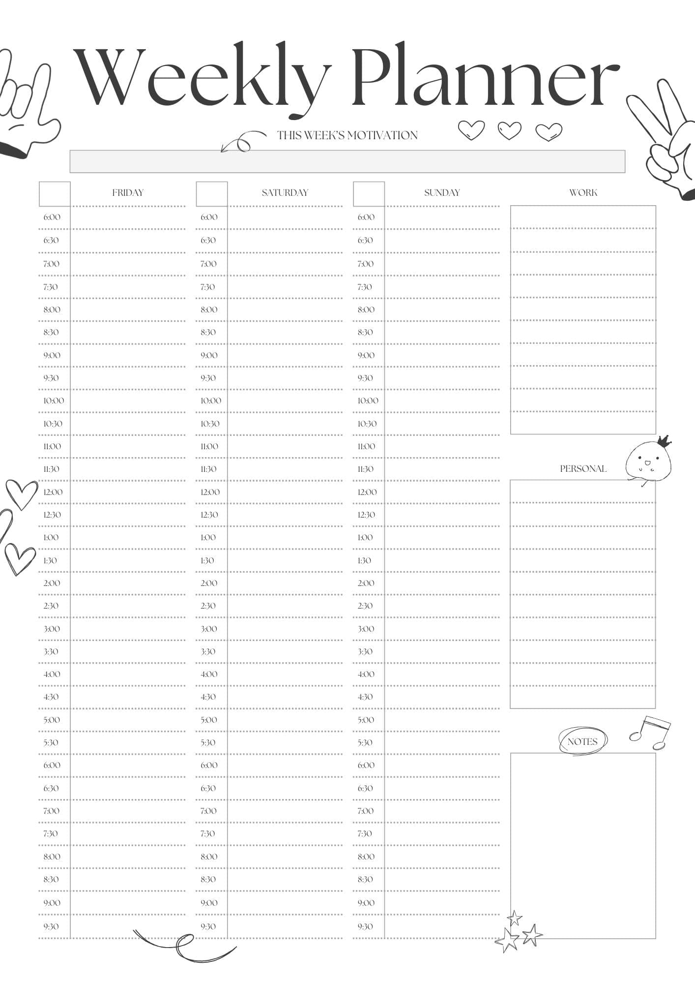 The Weekly Schedule Planner is a practical and easy-to-use tool designed to help you organize your time, increase productivity, and stay motivated throughout the week. This printable planner includes hourly slots from morning to evening for each day of the week, ensuring you can map out your schedule in detail and never miss an important task or appointment.